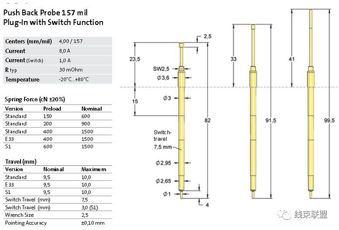 push back針具有很強(qiáng)大的彈力能夠直接接觸并反推待檢物體和結(jié)合機(jī)械機(jī)構(gòu)進(jìn)行連接測試;一旦待檢物體安裝正確,就能夠承受并壓制住此針,這種壓力能夠開啟這種開關(guān)的功能,該功能通過探針(內(nèi)置開關(guān)),或者針套亦或在下層安裝的一個接觸探針來實現(xiàn)。