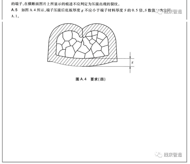 11.10 壓接后導(dǎo)體中所有單線的斷面應(yīng)呈不規(guī)則多邊形(呈蜂窩狀),端子壓接部位應(yīng)包住全部導(dǎo)體,銅絲應(yīng)該有明顯的壓縮變形,且均勻分布,如左下圖,A和B兩處應(yīng)無明顯縫隙,右下圖中的銅絲中有縫隙且銅絲變形不夠。